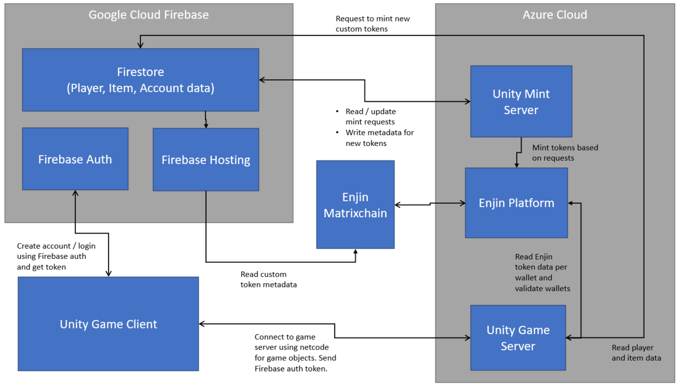 The Etherscape has built an online service designed to scale up to large numbers of concurrent players while enabling them to securely mint custom NFT items onto the Enjin blockchain. Below is an architecture diagram of how this is done along with some brief descriptions about how the different parts work.