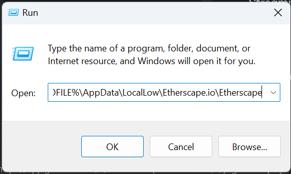 - Copy the string "%USERPROFILE%\AppData\LocalLow\Etherscape.io\The Etherscape" into the window and click OK.