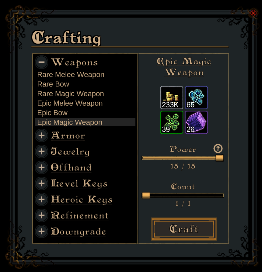 You can craft brand new items from resources at the crafting station. You can select the item type you want to craft as well as its rarity between rare (green) and epic (purple). You are also able to select the crafting power. The higher the crafting power the higher the level of the item as the higher the chance of a critical success. Items crafted with a critical success will be on rarity higher (so in the case of epic, the item will be legendary on a critical success).