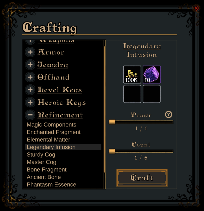 You can refine resources to a higher rarity at the crafting station. This ensures that all resources that you acquire are valuable and can over time be used to get very rare resources such as Legendary Infusions. It is also possible to downgrade resource to a lower rarity for gold.
