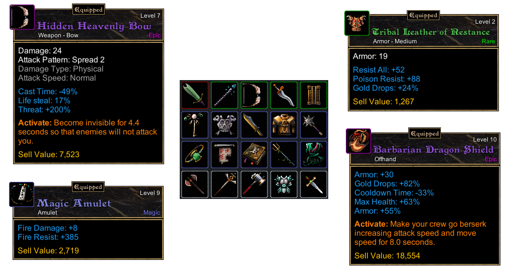 In addition to other properties, items can also have a randomly rolled rune attached to them. Equipping multiple items with specific rune combinations will add powerful bonuses to your character. Runes are similar to item sets found in other games. However, they do not dictate the exact item that is required for the set since any item could be rolled with the desired rune. As a result, runes highly encourage trading in order to collect items with matching runes of the desired type to optimize your build.
