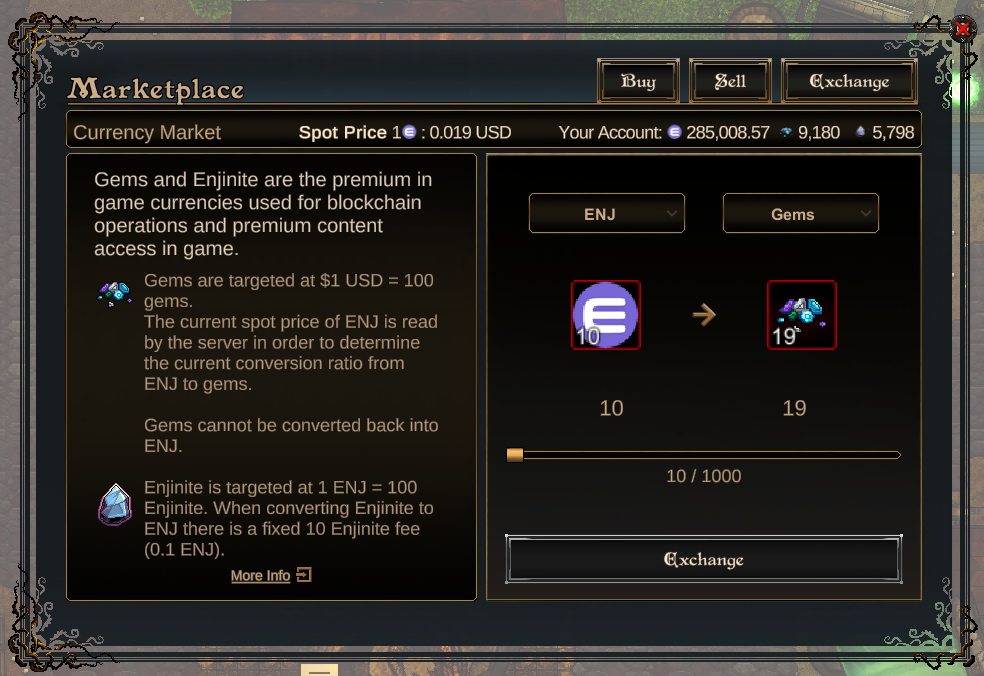 Gems are targeted at $1 USD = 100 gems. The current spot price of ENJ is read by the server in order to determine the current conversion ratio from ENJ to gems. Gems cannot be converted back into ENJ.