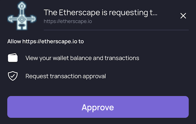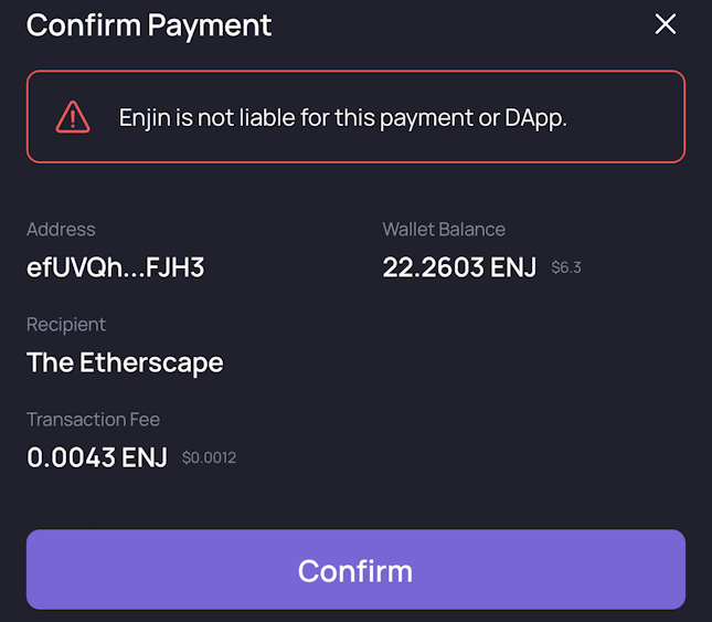 To purchase gems using ENJ from your private wallet it is necessary to run a transaction on your behalf. In order to do this, we use Wallet Connect. When you click the buy button, it will kick off the process. The transaction window will come with a QR code for you to scan. Scan this QR code using the Enjin Wallet app. After you scan it, you will get a prompt to accept that looks like the following...