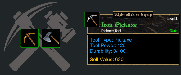 In order to gather from a node, you must have the relevant tool equipped. For example, to mine ore you need a pickaxe and to chop wood you need an axe. Each tool provides a certain amount of crafting power and has a certain amount of durability.