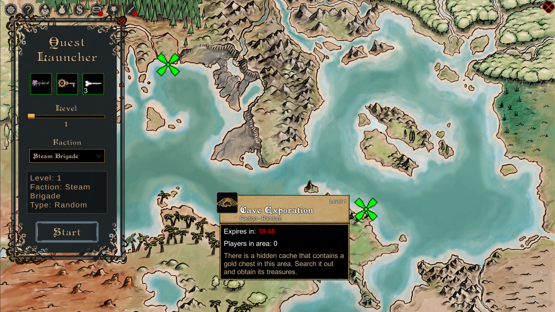 Players are able to start new quests from town. Completing the quests will require fighting through enemy locations and in many cases defeating a boss character at the end. Fully completing the quest will yield powerful rewards based on the difficulty of the quest.